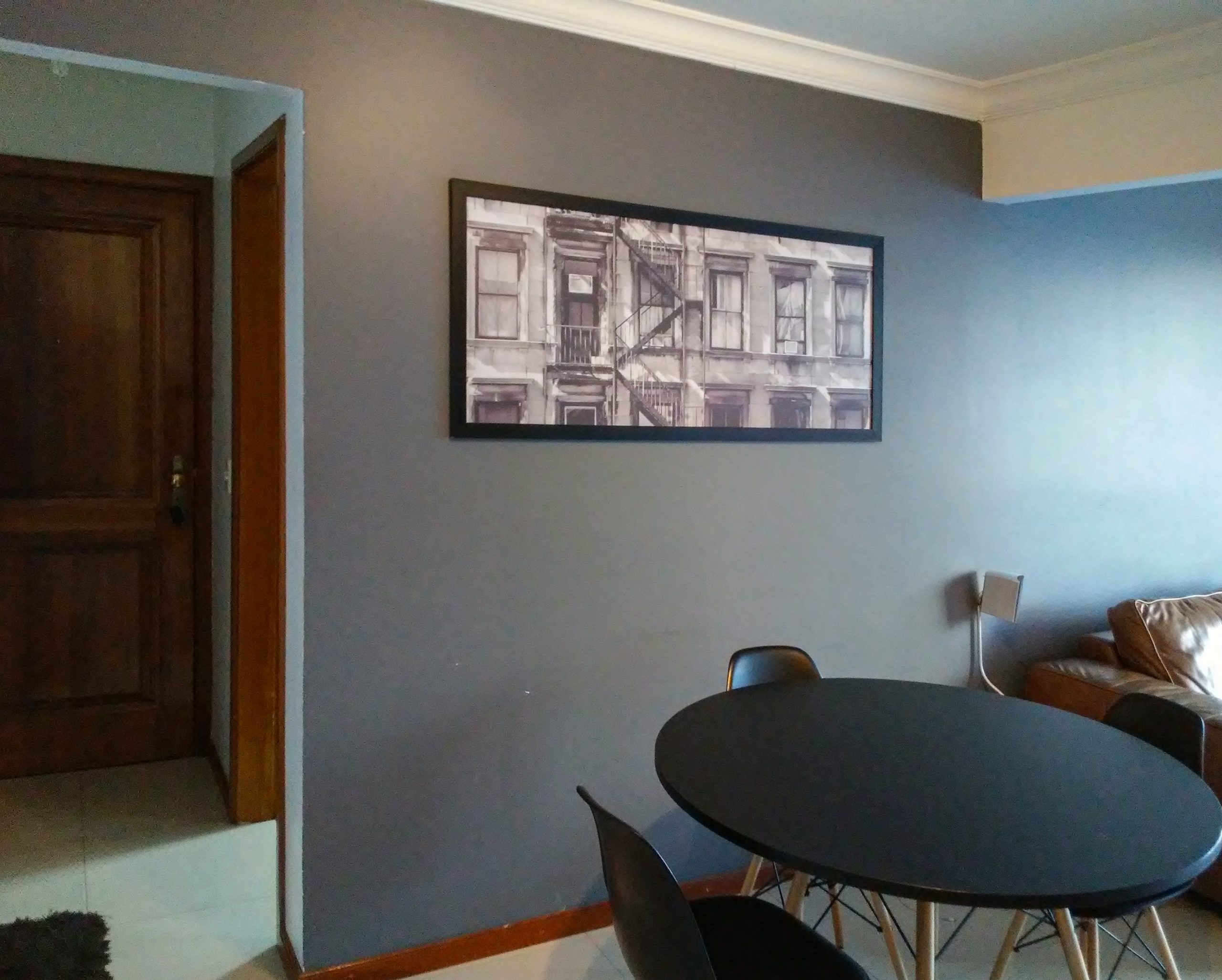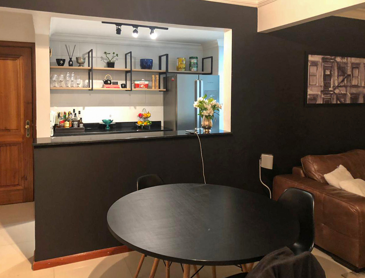 Esta é uma reforma do interior de um apartamento, com paredes e mobiliários repaginados, libertado da divisória entre a cozinha e a sala de jantar, de forma a conseguir um único espaço.