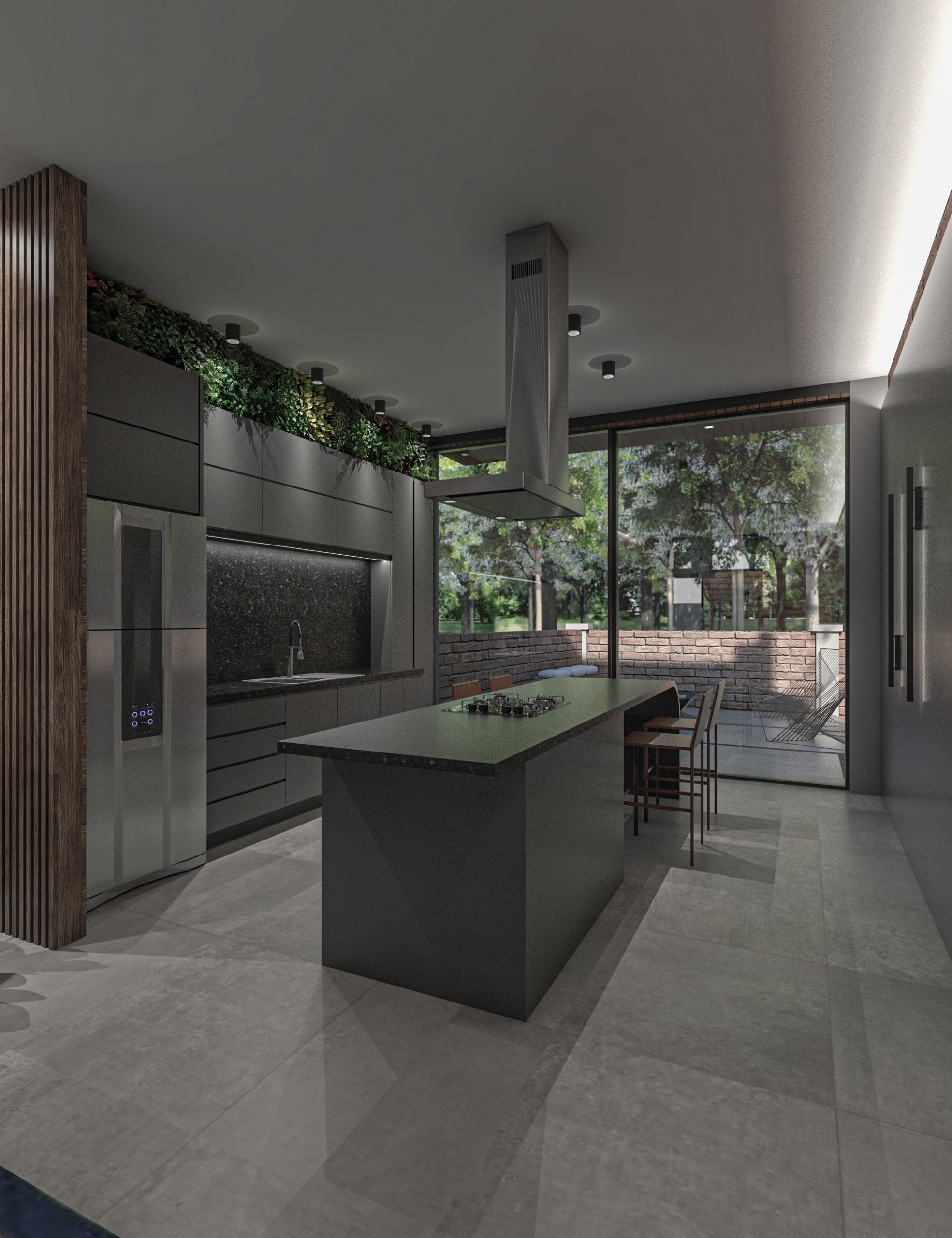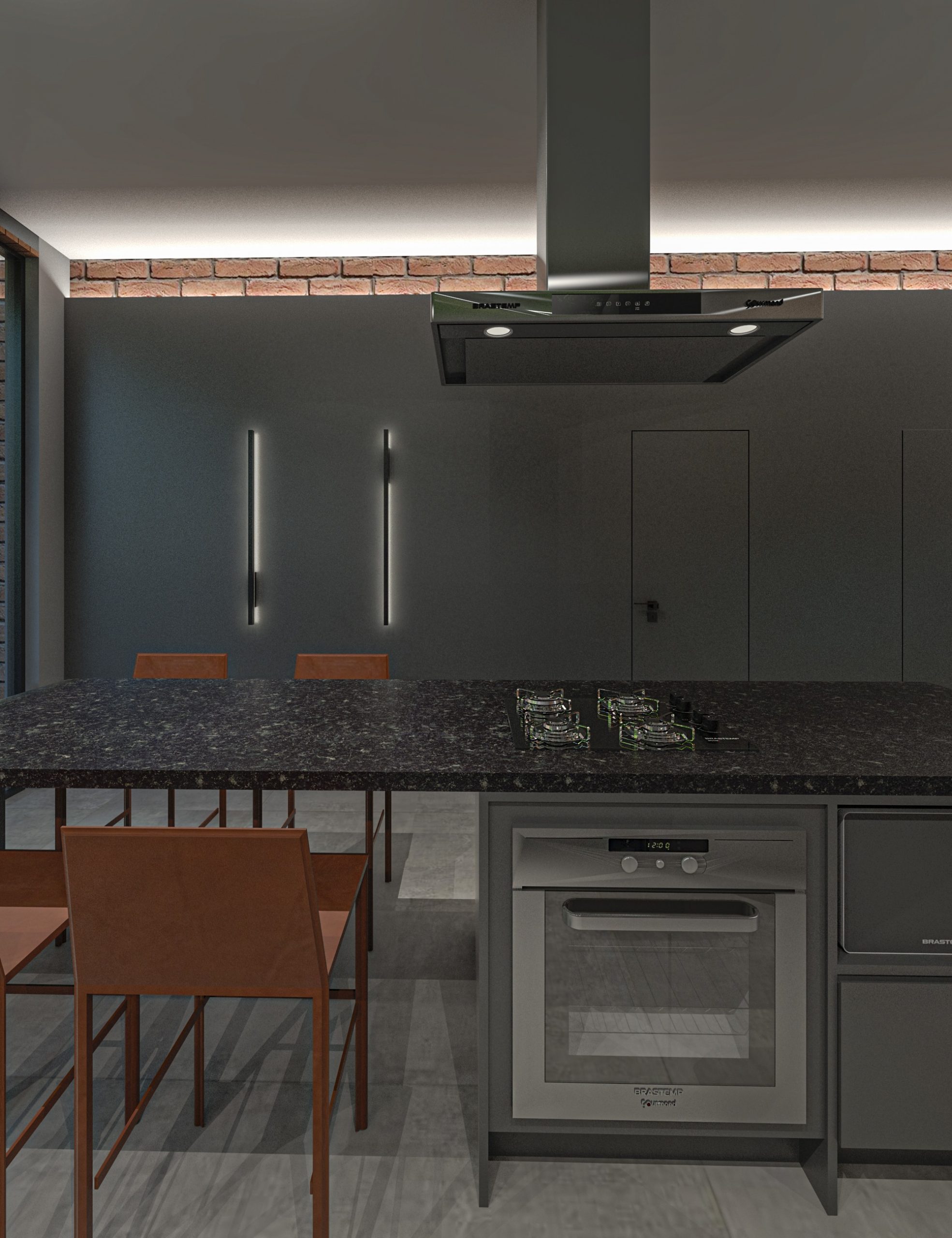 Como o espaço já era pequeno, a proposta criada transformou o ambiente em um lugar super acolhedor, exaltando o contato com a área externa. Para integrar os ambientes pensando na socialização, a cozinha tem o papel de âncora na disposição do espaço, tornando-se o “coração da casa”.