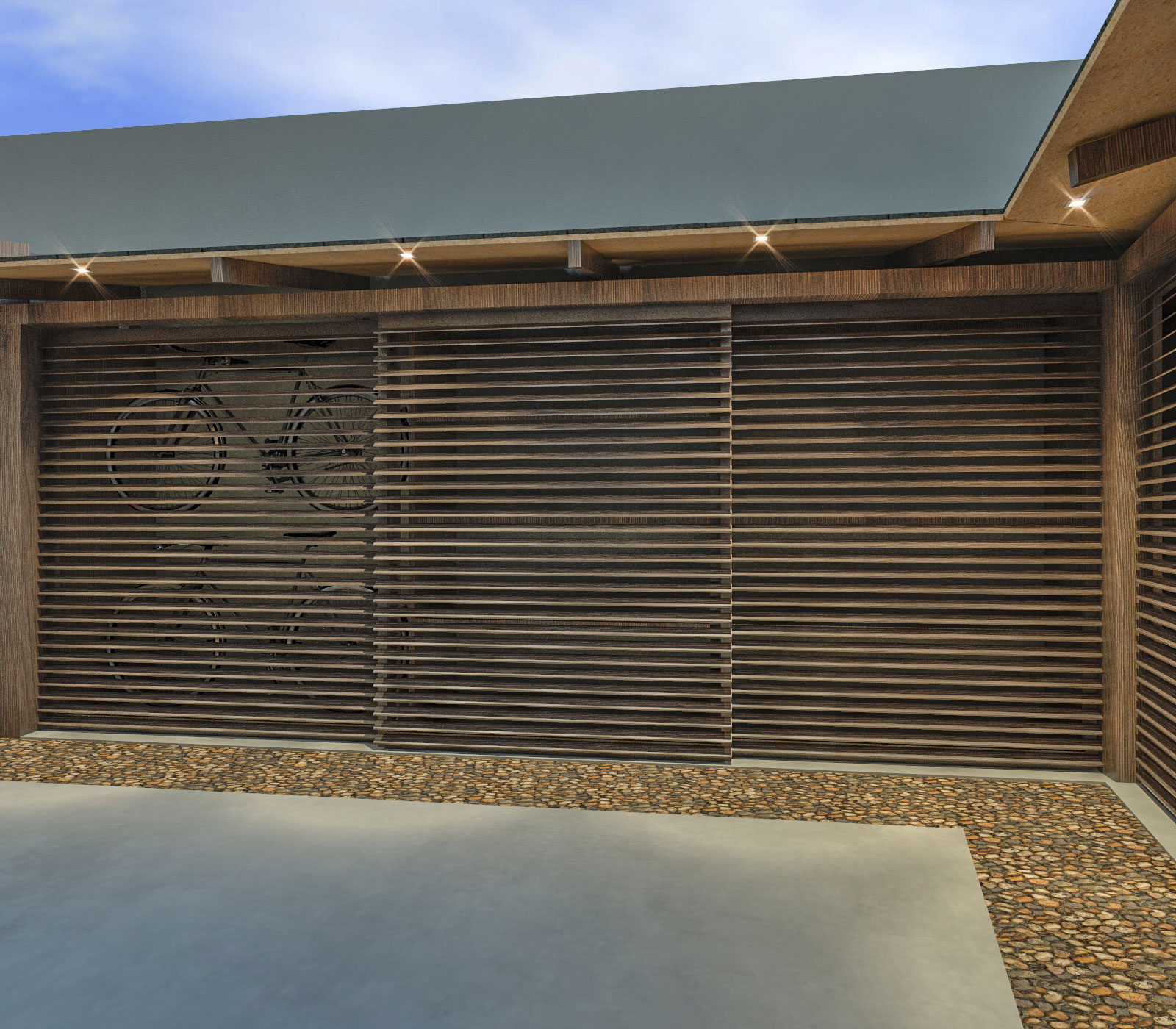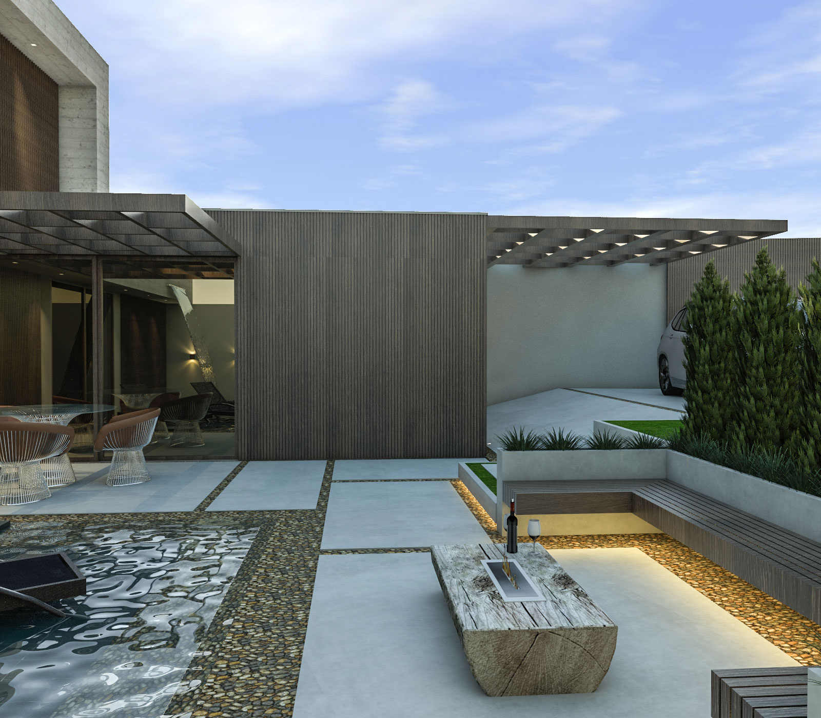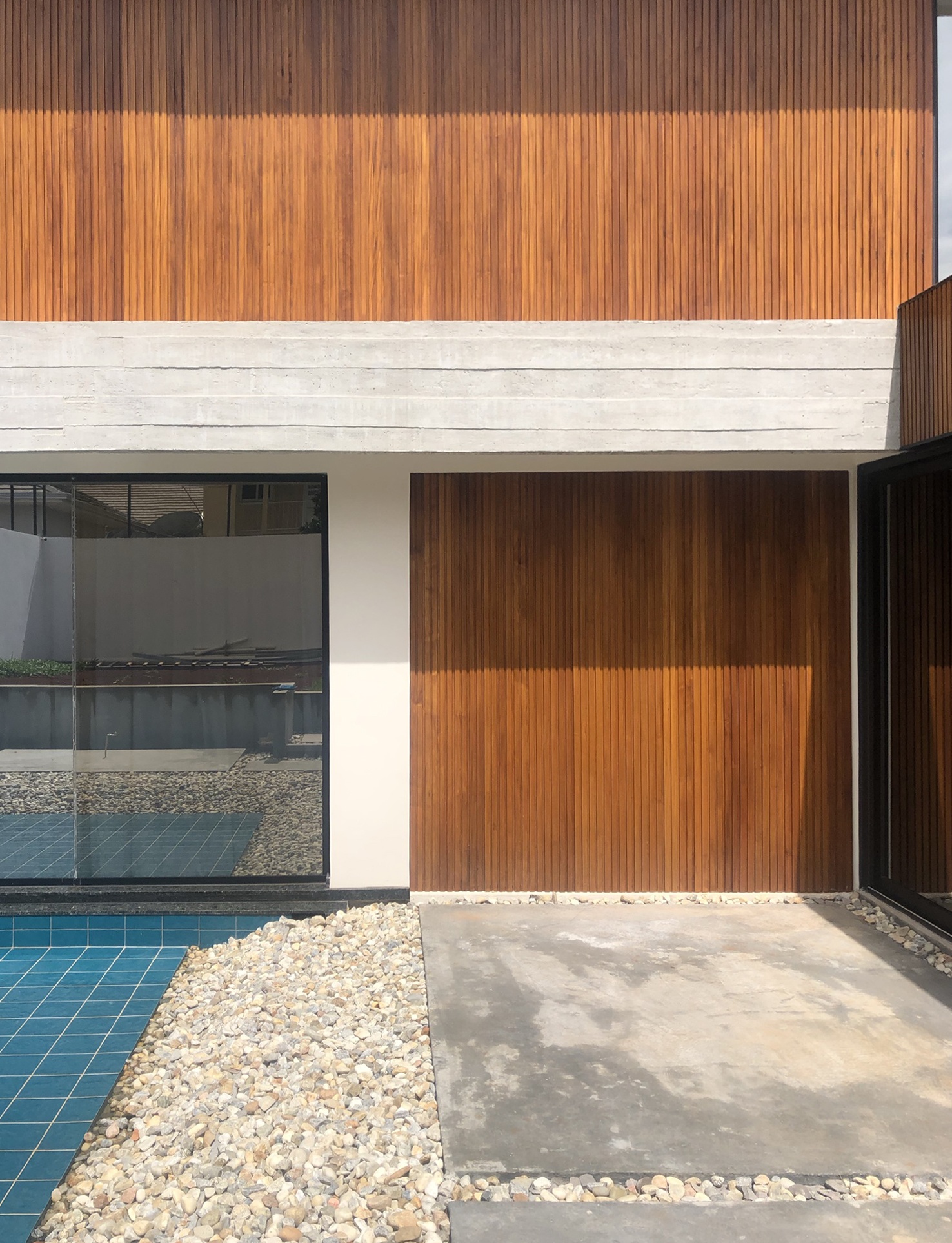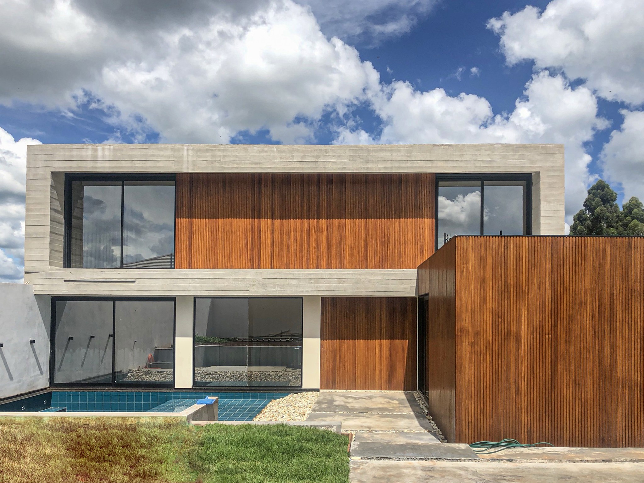 O projeto dessa residência consiste em linhas modernistas, mas, sobretudo, alma orgânica, priorizando a naturalidade dos materiais. A garapeira ripada, presente em grande parte da fachada e também nos espaços internos, aquece a linguagem modernista.
