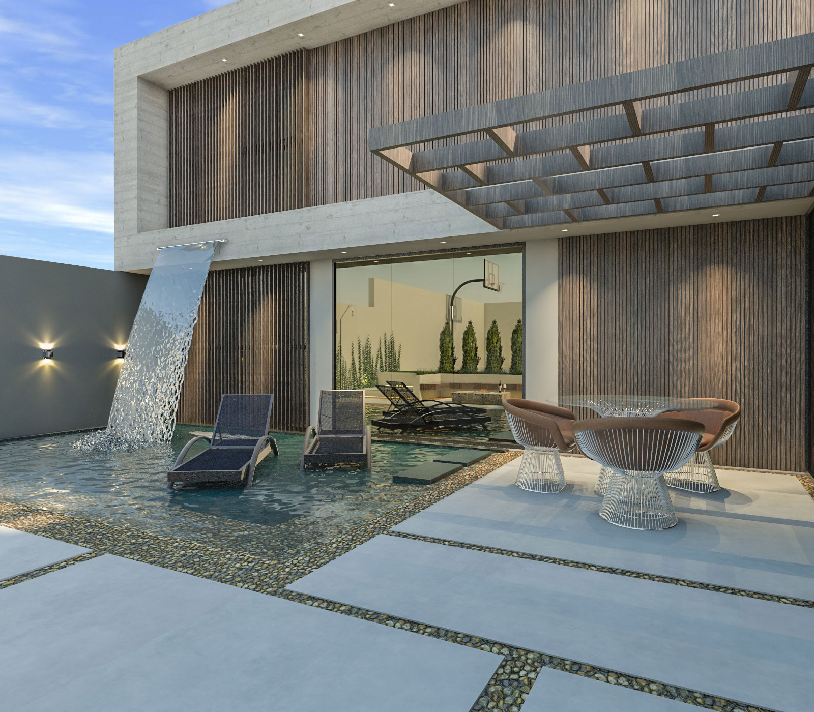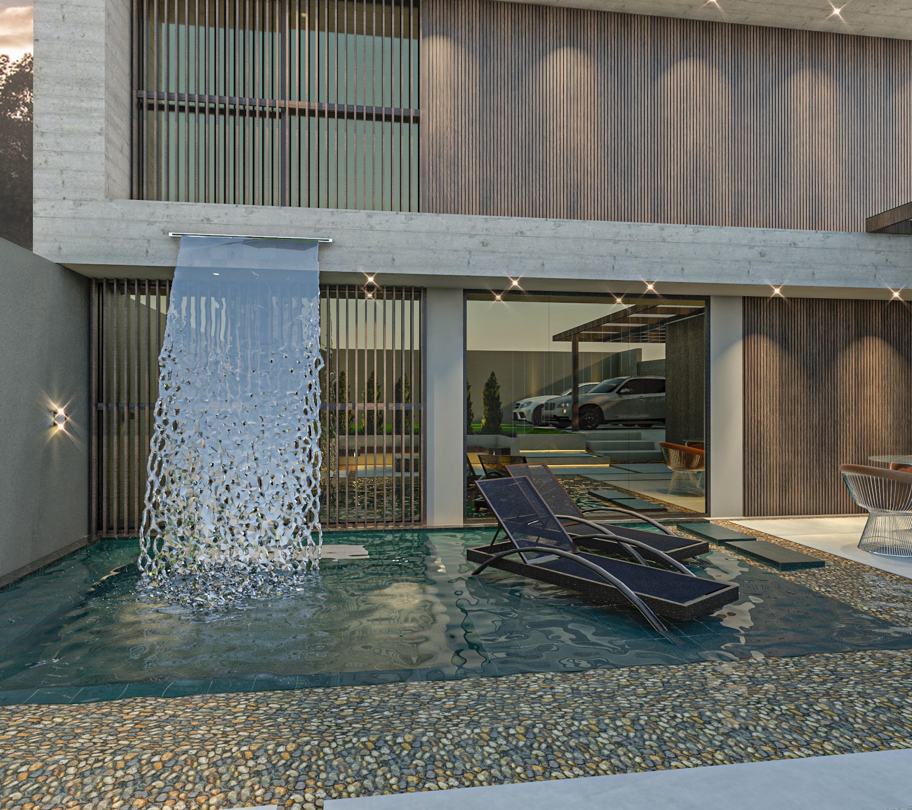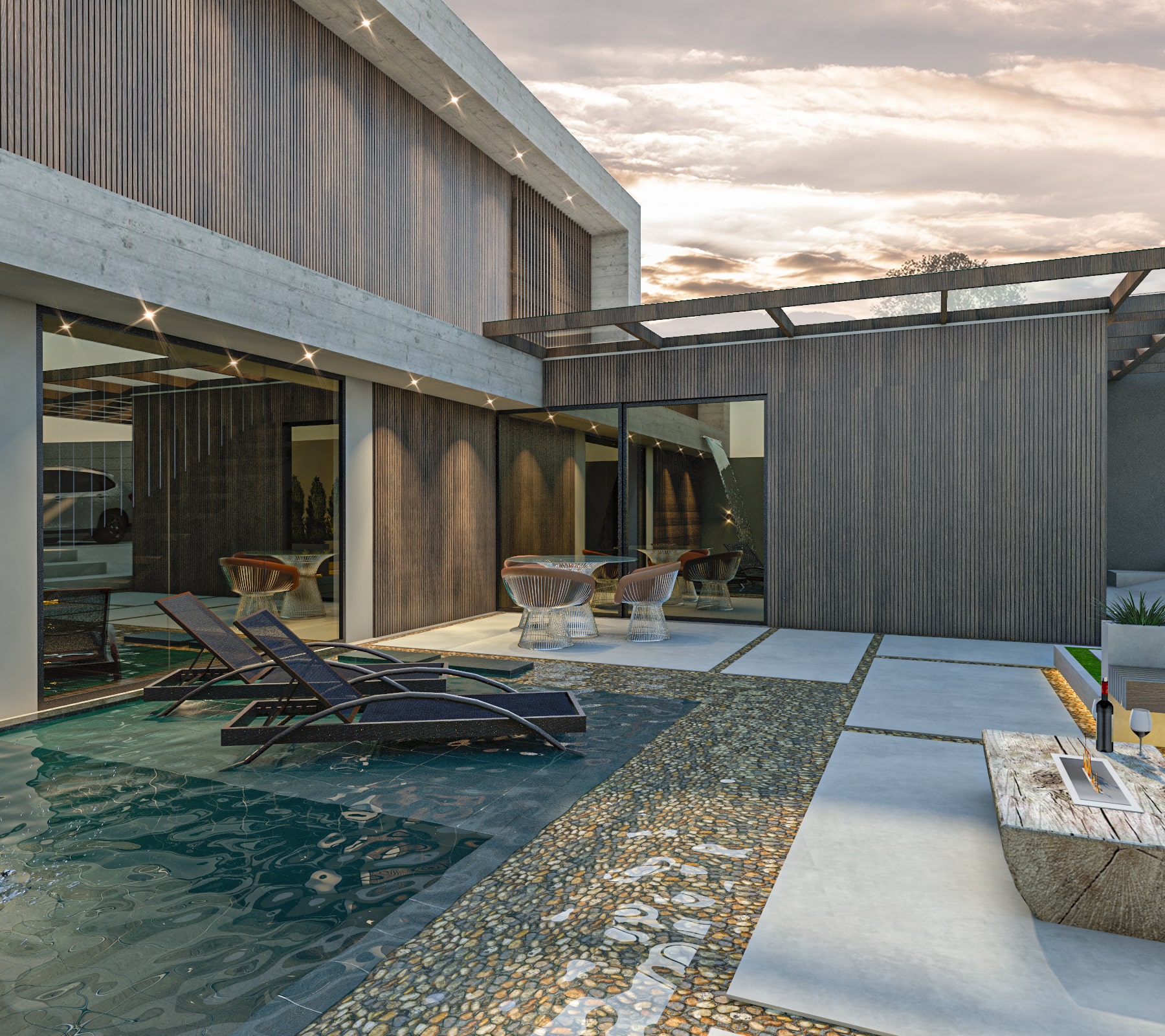 Já o concreto aparente, que contrasta com os calorosos ripados de madeira, promove privacidade e conforto térmico para a área íntima. Apesar das formas retilíneas, dos grandes vãos e da imponência do volume, a casa ganha intimidade, calor e escala humana. Para conectar o externo e o interno, surge um pátio aberto e a piscina de borda infinita coberta por pedras de rio. Pontos que adicionam leveza à construção, além de completarem a sensação de que ela flutua.
