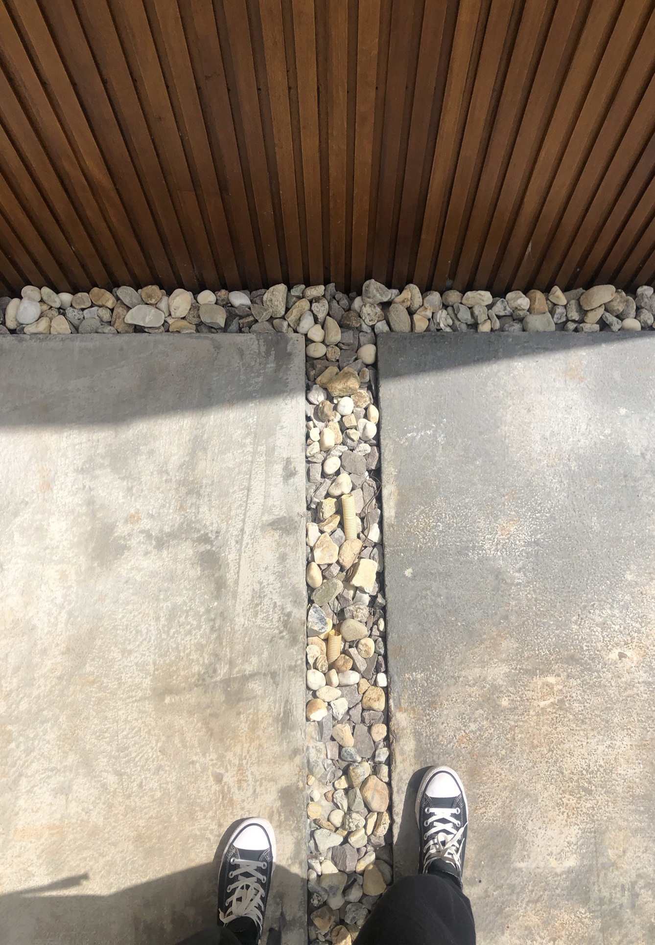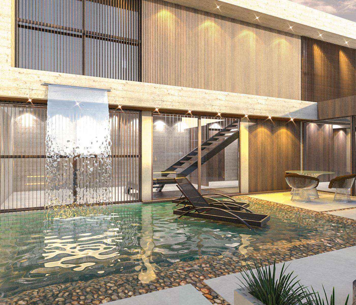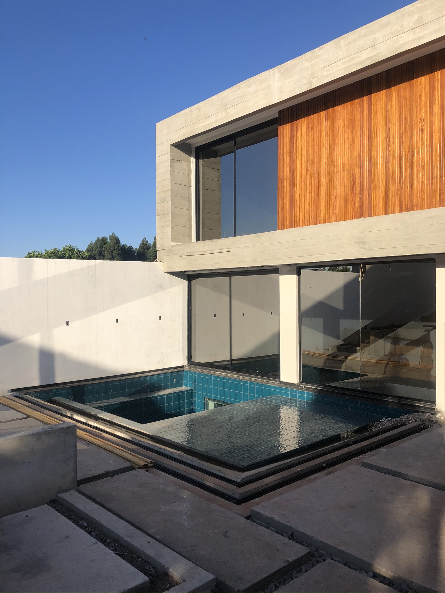 Já o concreto aparente, que contrasta com os calorosos ripados de madeira, promove privacidade e conforto térmico para a área íntima. Apesar das formas retilíneas, dos grandes vãos e da imponência do volume, a casa ganha intimidade, calor e escala humana. Para conectar o externo e o interno, surge um pátio aberto e a piscina de borda infinita coberta por pedras de rio. Pontos que adicionam leveza à construção, além de completarem a sensação de que ela flutua.